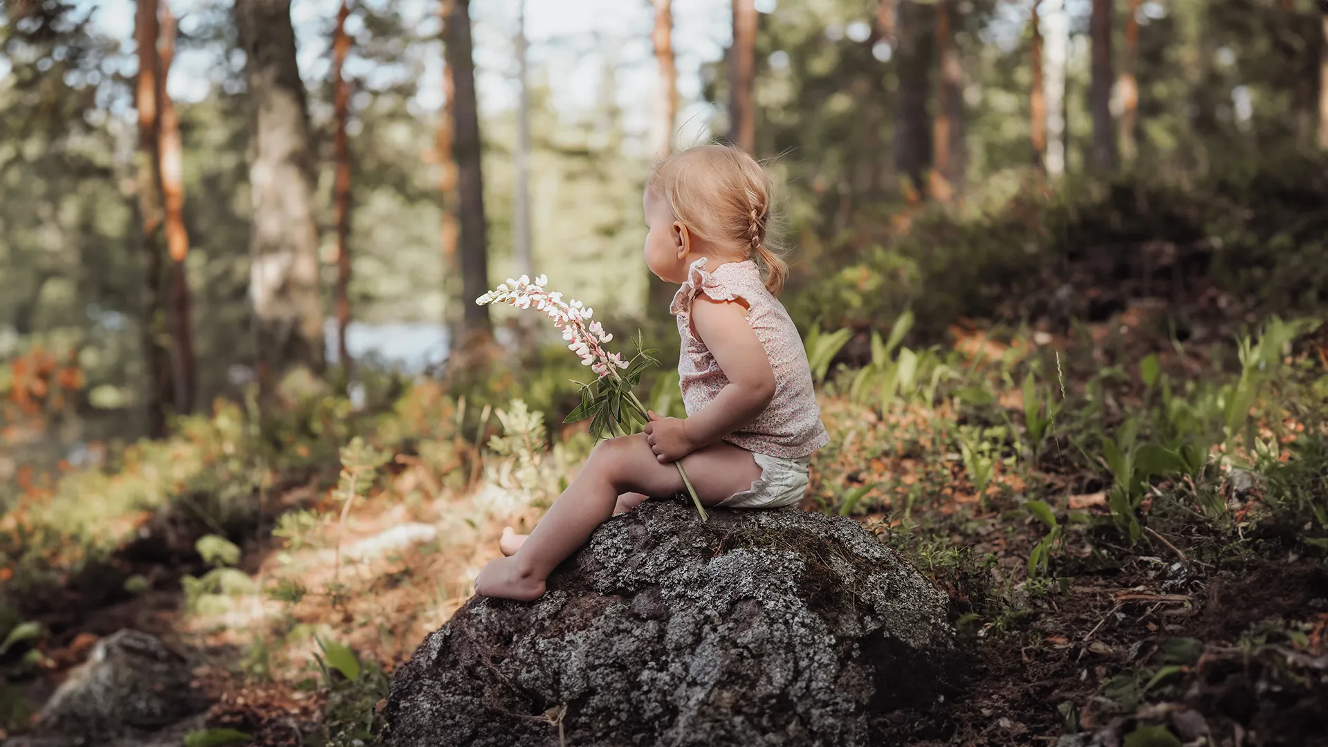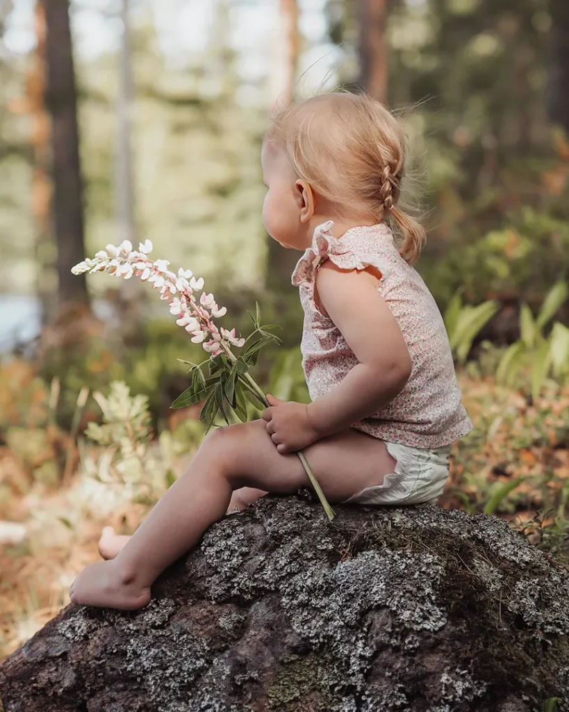 Lapsi istuu kiven päällä kotimaiset Moomin Baby -vaipat jalassa