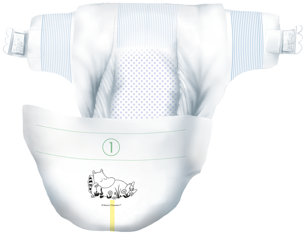 Moomin Baby Newborn tape diapers in sizes 1 and 2 have a special design at the navel, making them gentle on the delicate navel of your newborn. Our smallest diapers 1, 2 and 3 also have a convenient moisture indicator that changes colour from yellow to blue to indicate when the diaper needs changing.